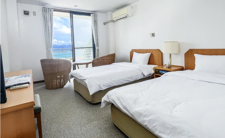 「イエリゾート」は、全室オーシャンビューで、エメラルドグリーンに染まる東シナ海の風景が窓の向こうに広がります。